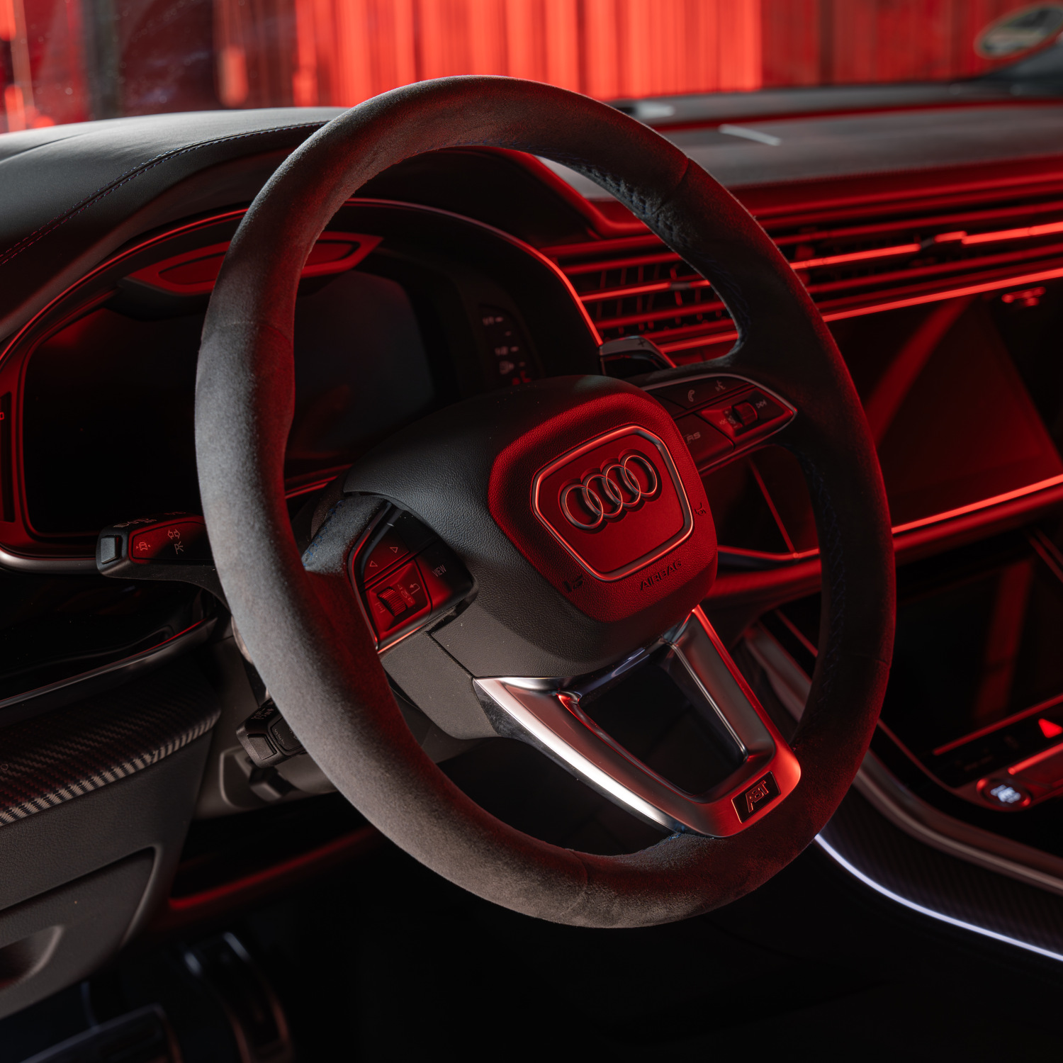 It is often the little things that make the difference. Details such as the seat refinement with the ABT logo in the headrest and RSQ8-S logo, the ABT steering wheel badge and the gear knob cap in matt visible carbon create an atmosphere that you can feel as soon as you take your seat.