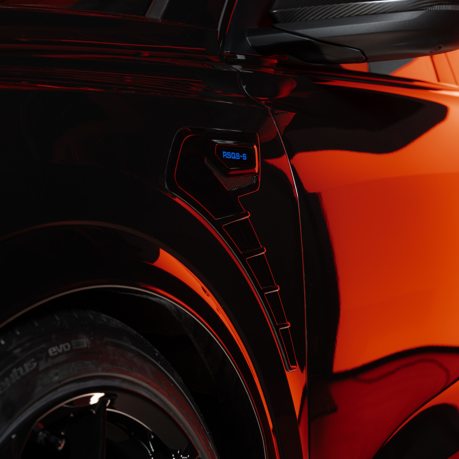 The front spoiler in matt visible carbon fibre sets a clear line – confident, precise, unmistakable. The glossy black wheel arch vents on the front wings with integrated RSQ8-S emblem badge emphasise the striking appearance. At the rear, the rear wing in matt visible carbon fibre completes the silhouette in a striking manner. At the rear, the rear wing in matt visible carbon fibre completes the silhouette strikingly.