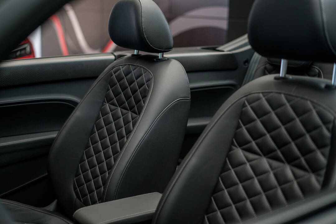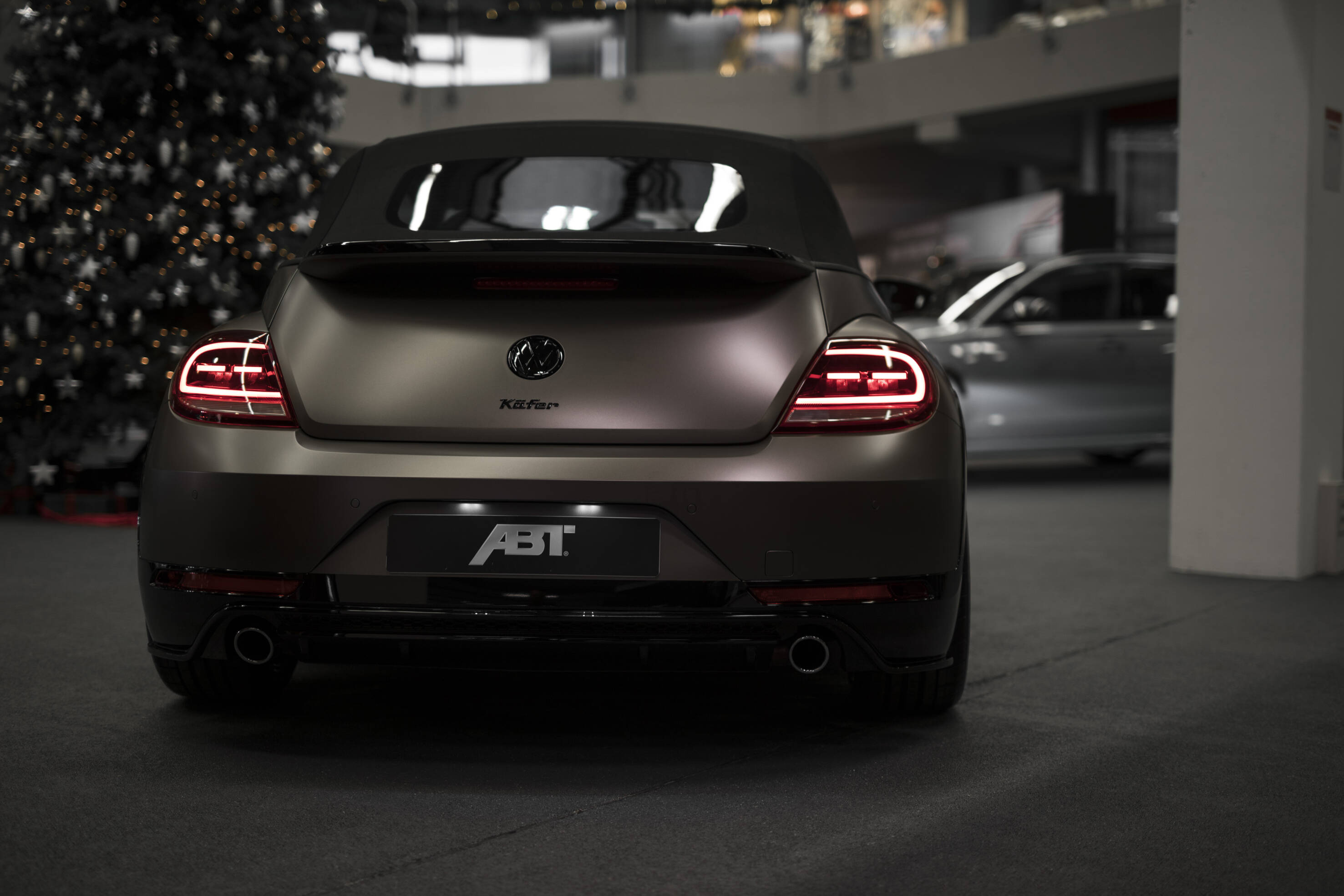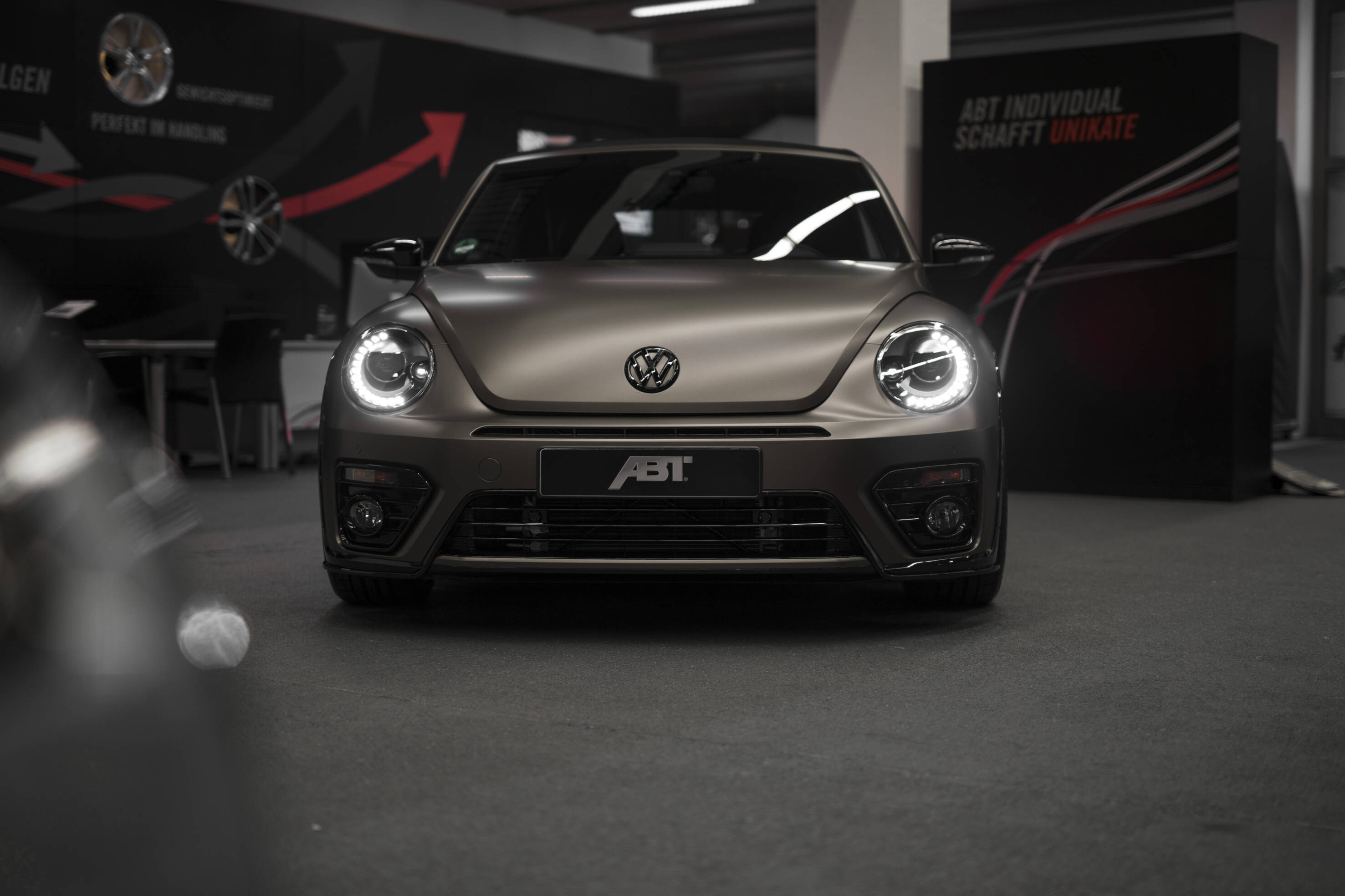 One of the latest projects – a VW Beetle convertible – was designed and rebuilt for the managing director of a medium-size company. The car has a full film wrap in a subdued shade of bronze and is elegantly understated. The different nature becomes obvious primarily in the “undertones”, such as brand logos painted black. Another distinctive detail are the 19” wheels of type ABT ER-C which ABT Individual specially painted in a silver-bullet shade. As a standard, the attractive wheel for the Beetle is supplied only in gun-metal or matt black. Thanks to the open design, the 6-piston brake calipers and the 370 x 35 mm brake discs of the