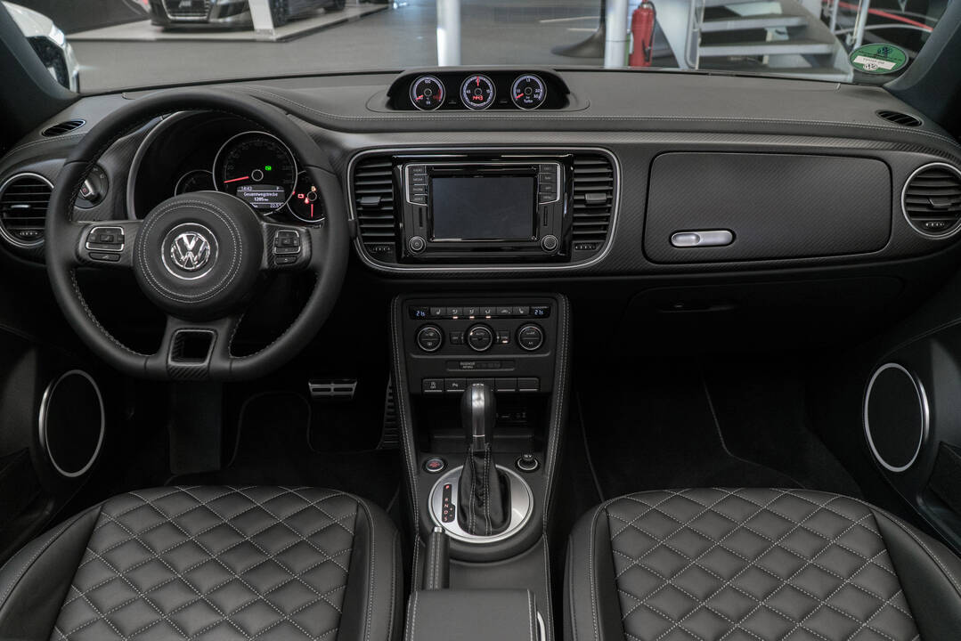 But the true highlights of the conversion only become evident when sitting in the car or when the top is down: the extensive saddler’s craft work in the interior. Where the original is dominated by dark plastic, this model is a dream in leather and carbon. ABT used elegant leather to cover the dashboard, its substructure, the console for the auxiliary instruments and the door center parts including the arm rests from front to rear. Finest leather also adorns the door handles, the inside of the roof pillars, the sun blinds and entrance areas as well as the column, wheel and airbag of the steering wheel assembly. To satisfy the sporty character of this unique beetle, the ABT Individual team also covered all black plastic panels on the interior with real carbon. Overall, all conversions are of the highest grade. Only the suspension is “low” – thanks to carefully set up ABT suspension springs. The leading tuner for Volkswagen and Audi shows that, despite the size of the company, detail work can be very individual.