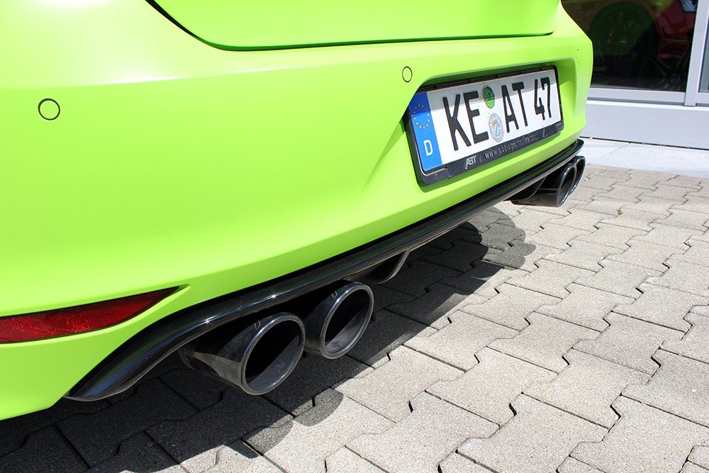 The visual effects could indeed be Hollywood-made. The globally largest tuner of cars produced by the Volkswagen Group has given the aggressive Golf a bilious green car wrap, which has even left its mark on the 20’’ ABT-FR wheels and makes this compact rocket appear as if it came from a different planet. The high-quality ABT front grille, matching head light covers and side skirts and the tailgate add-on really come into their own here. Particularly impressive are the four mighty black-chrome-plated tailpipes of a diameter of 102mm.